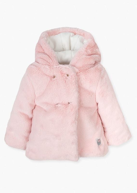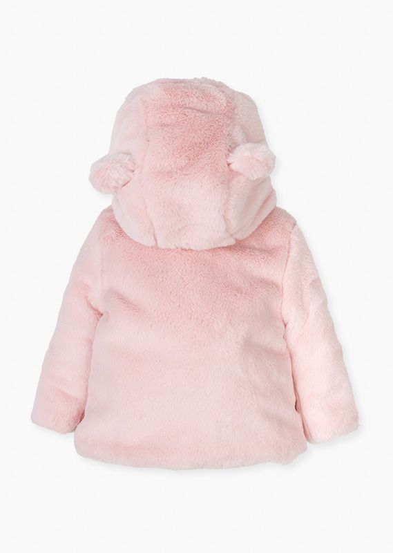 Abrigo de pelo y capucha para bebé niña. Abrigo con capucha. Abertura en delantero con botones en la parte arriba. Con orejas en la capucha. Con forro interior de punto liso.