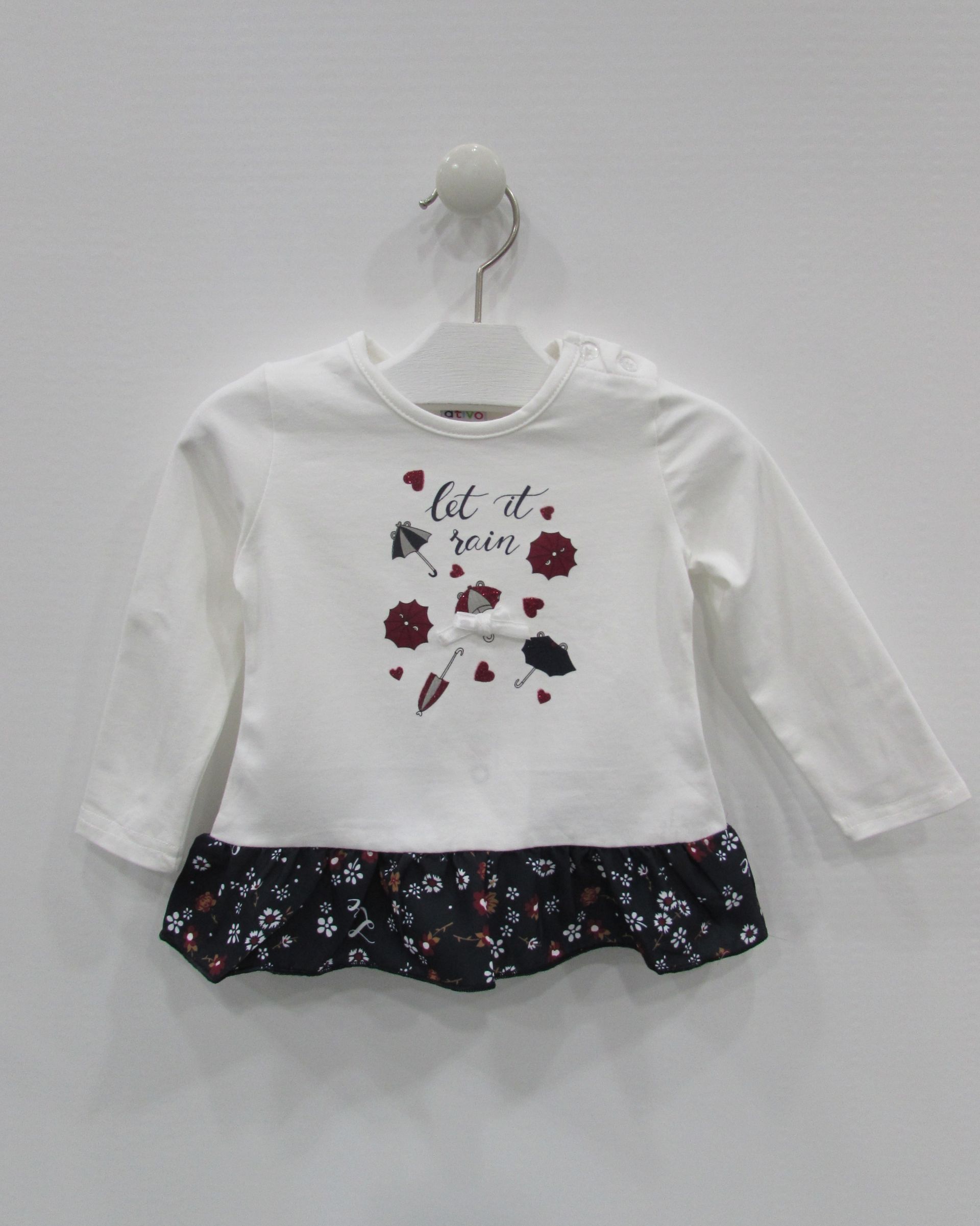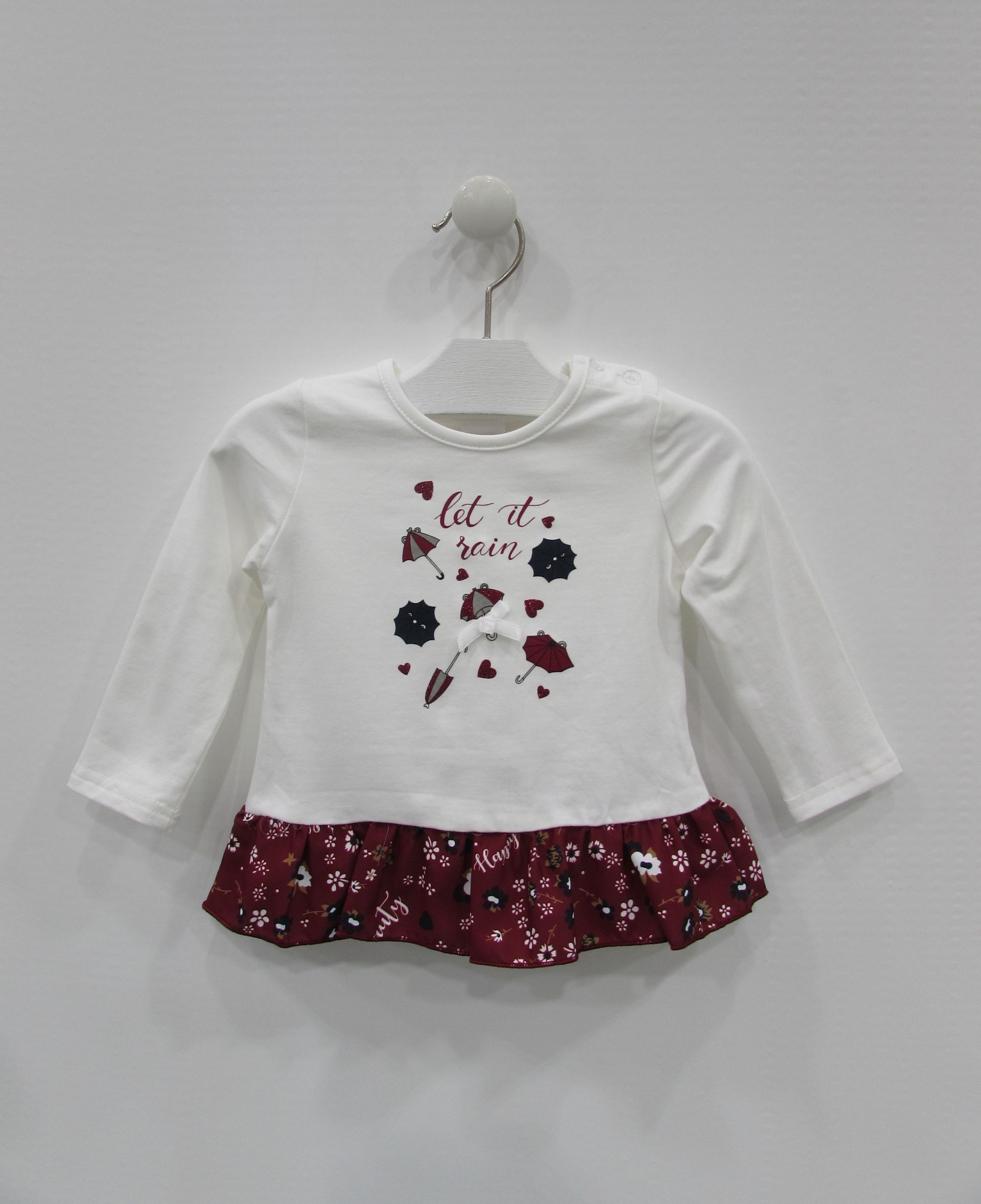 Camiseta combinada para niña. Camiseta en color crudo y combinado con tele en granate o azul marino.