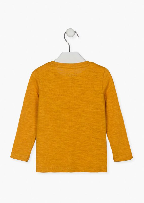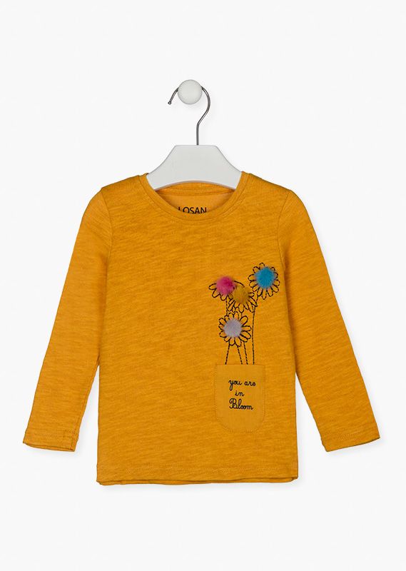 Camiseta con bolsillo en color amarillo mostaza para niña. Camiseta de punto. De manga larga y cuello redondo. Con bordado y estampado en lateral del delantero. Con detalles de pompones en el bordado. Cuello en tejido de canalé.