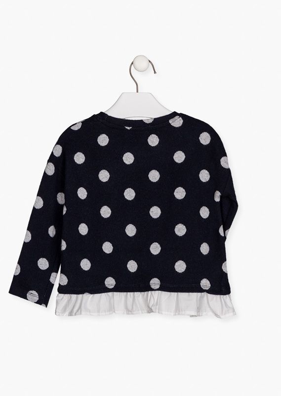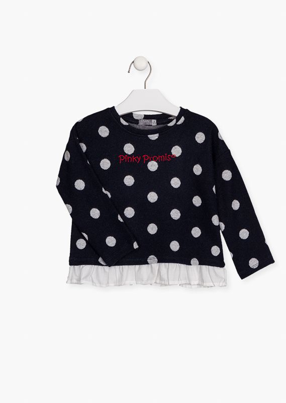 Camiseta con camisa simulada en bajos para niña. Camiseta de punto lanoso de manga larga y cuello caja en color azul marino con bolos en color natural. Con bordado en pecho de frase.
