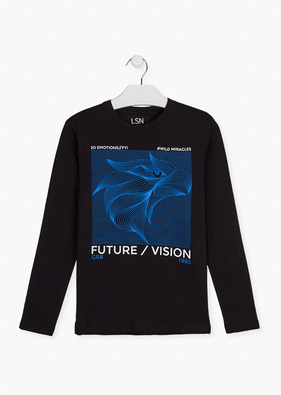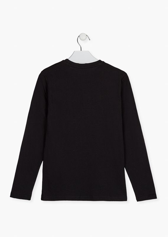 Camiseta con estampado de líneas para chico. Camiseta de manga larga y cuello redondo de canalé. Tejido de algodón. Estampado engomado en el delantero. Disponible en varios colores y modelos.