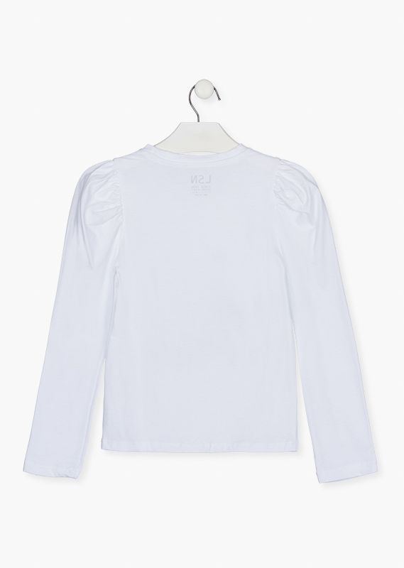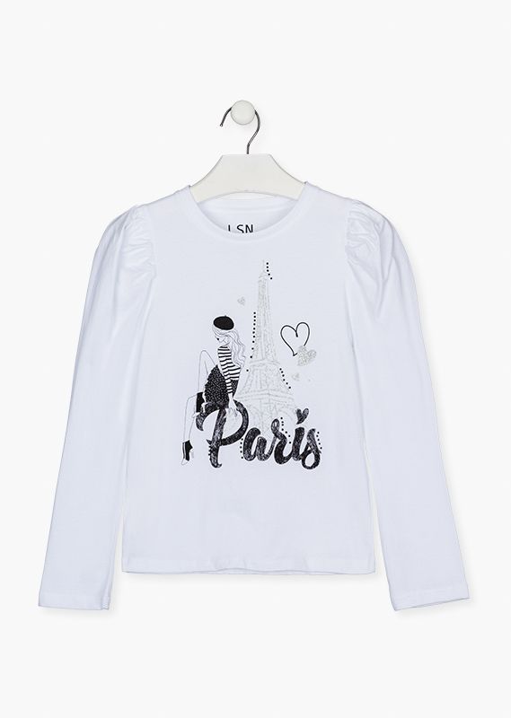 Camiseta con estampado de Torre Eiffel para chica. Camiseta de color blanco con manga larga fruncida. Tejido de algodón. Cuello redondo.