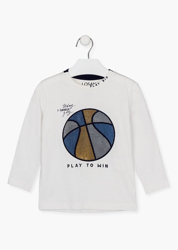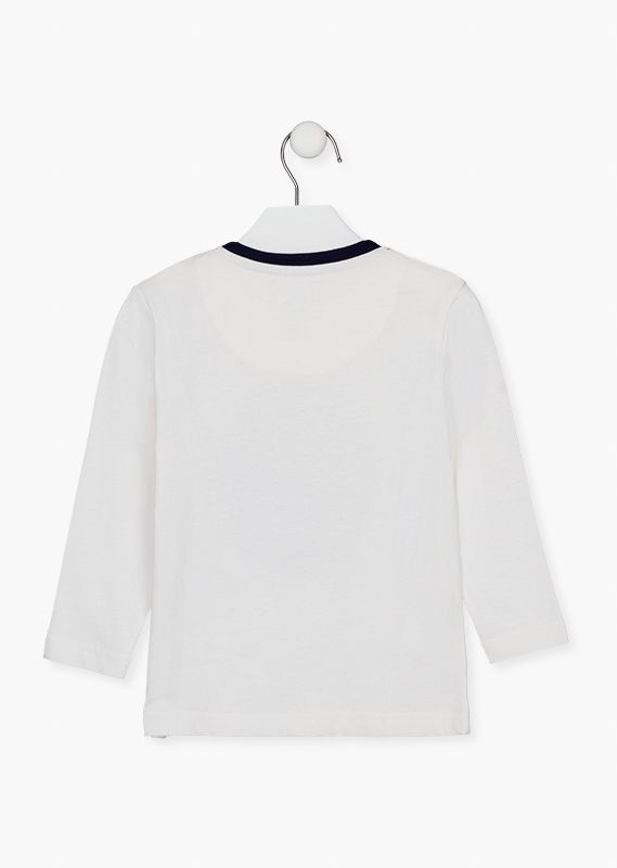 Camiseta con estampado engomado abultado para niño. Camiseta de punto con estampado en el delantero. Cuello caja en tejido de canalé con estampado engomado en un lateral.