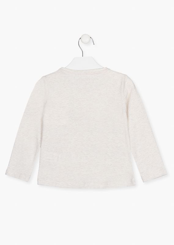 Camiseta con jirafa de lentejuelas para niña. Camiseta de punto de algodón orgánico en color natural con cuello caja y manga larga. Con estampado, parches y bordados en el delantero. Con cubrecosturas en el interior del cuello.