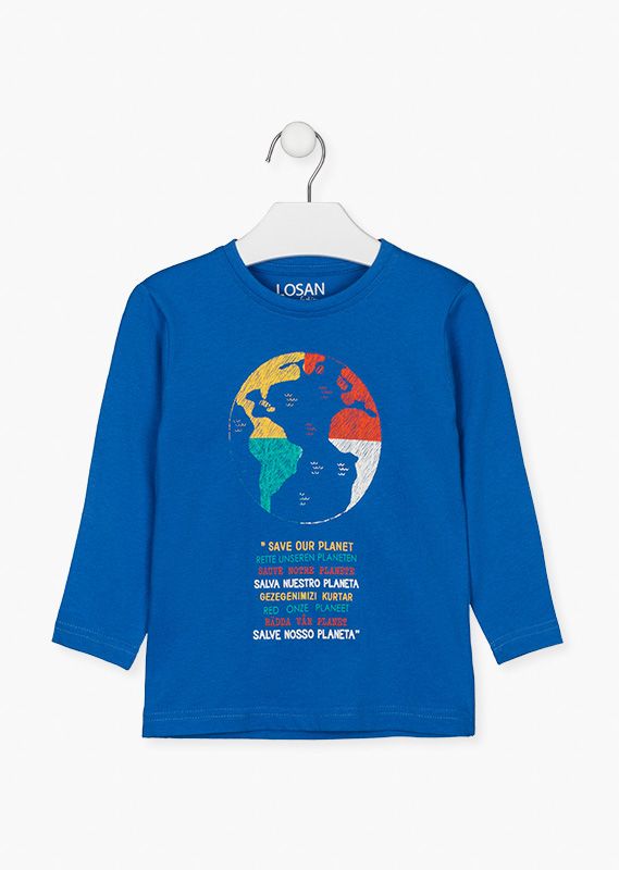 Camiseta con mensajes medioambientales para niño. Camiseta de manga larga y cuello caja en punto de algodón orgánico. Con estampados en el delantero. Disponible en varios modelos y colores.