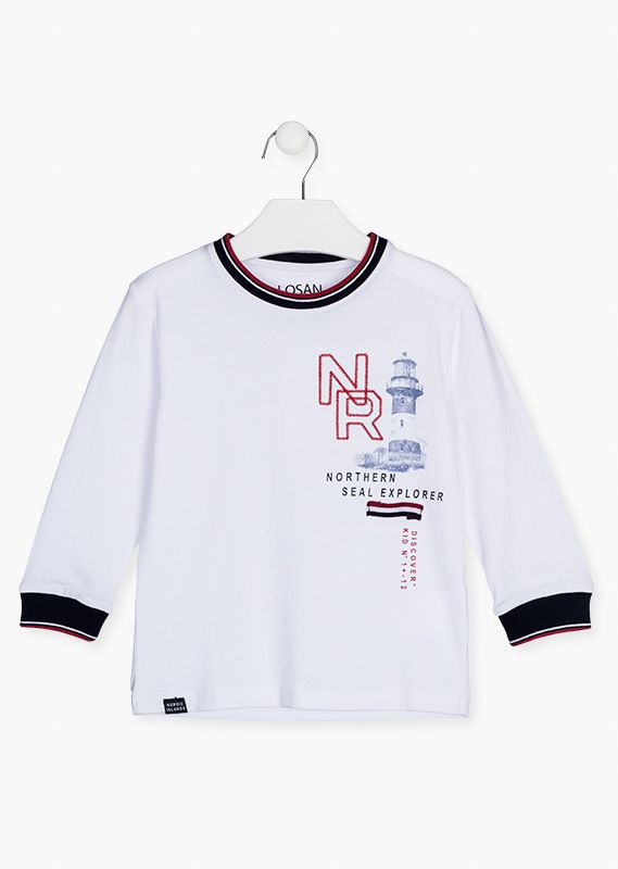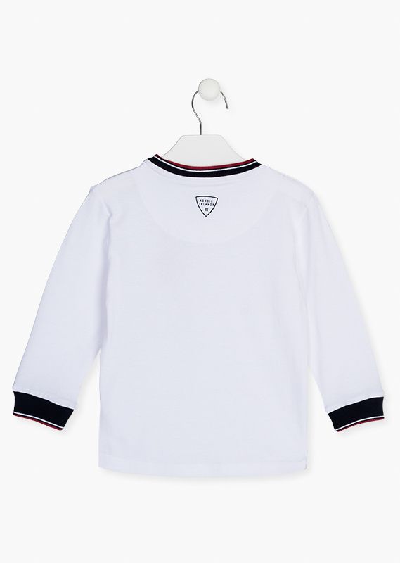 Camiseta con puños y cuello en tejido de canalé de rayas para niño. Camiseta de punto en color blanco con estampado y bordado en el pecho. Con etiqueta decorativa en los bajos.