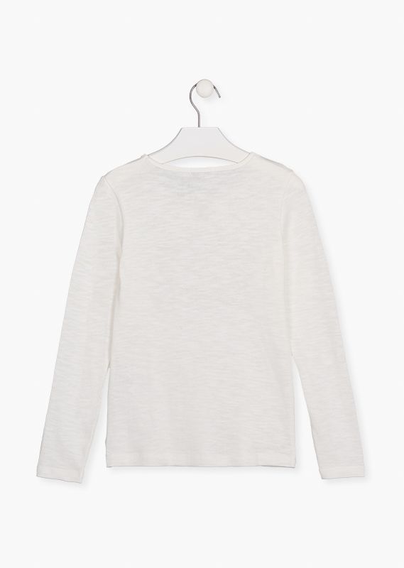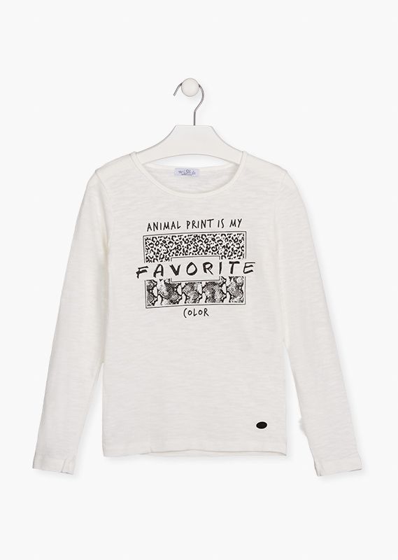 Camiseta de algodón de color natural para chica. Camiseta de manga larga. Cuello redondo. Estampado animal en el delantero. Etiqueta de marca cosida en el bajo.