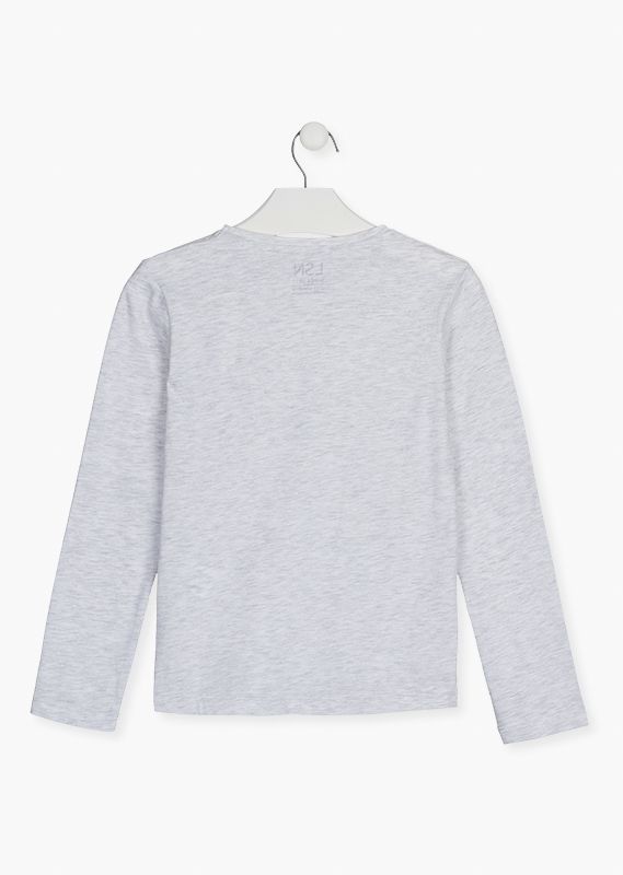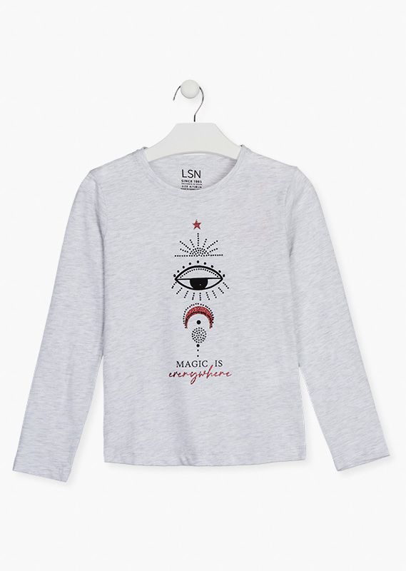 Camiseta de color natural en tejido de algodón para chica. Camiseta de manga larga. Cuello redondo. Estampado mágico delantero. Con detalle de tachuelas.
