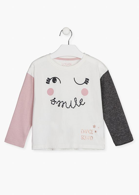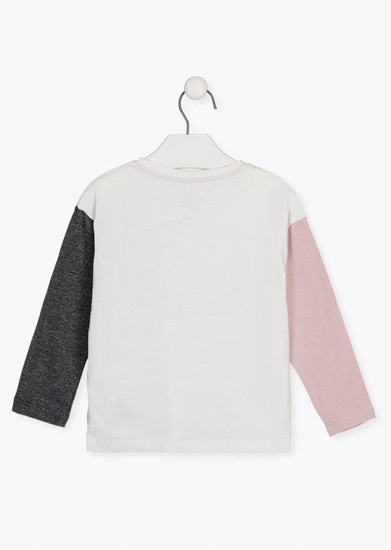 Camiseta de manga larga caída a contraste para niña. Camiseta de punto con cuello caja. En color natural con mangas rosa y gris oscuro. Con estampado en el delantero engomado y de brillantina. Con cubrecosturas en el interior del cuello.