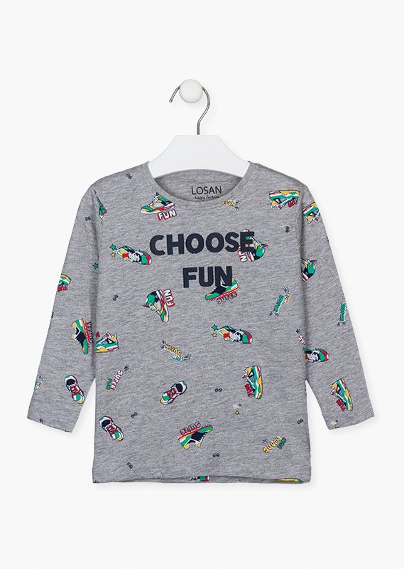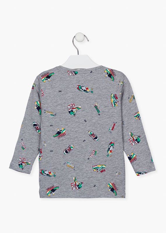 Camiseta de punto estampada con zapatillas para niño. Camiseta de manga larga y cuello caja en color gris. Con estampado engomado en el pecho.