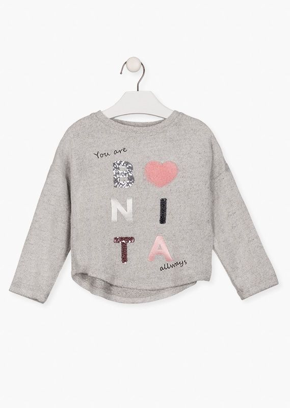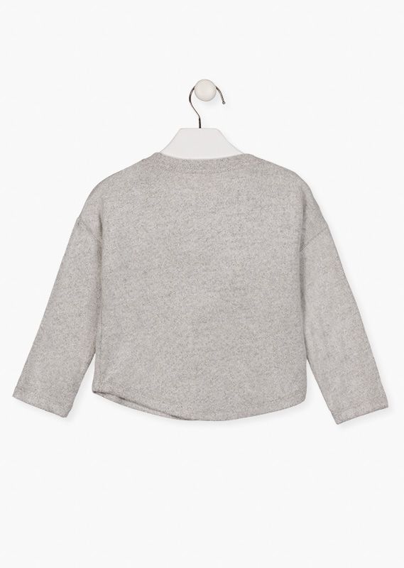 Camiseta en color gris con lentejuelas para niña. Camiseta de punto lanoso de manga larga y cuello caja. Con estampado y parches de pelo en el delantero. Con bajo redondeado en los laterales. Con cubrecosturas en el interior del cuello.
