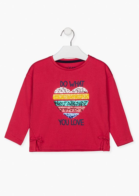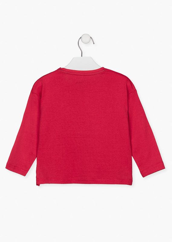 Camiseta en color rojo con lazos para niña. Camiseta de punto de manga larga y cuello caja. Con estampado y lentejuelas en el delantero. Con costura lateral inclinada hacia delante con abertura en bajos. Con cubrecosturas en el interior del cuello.