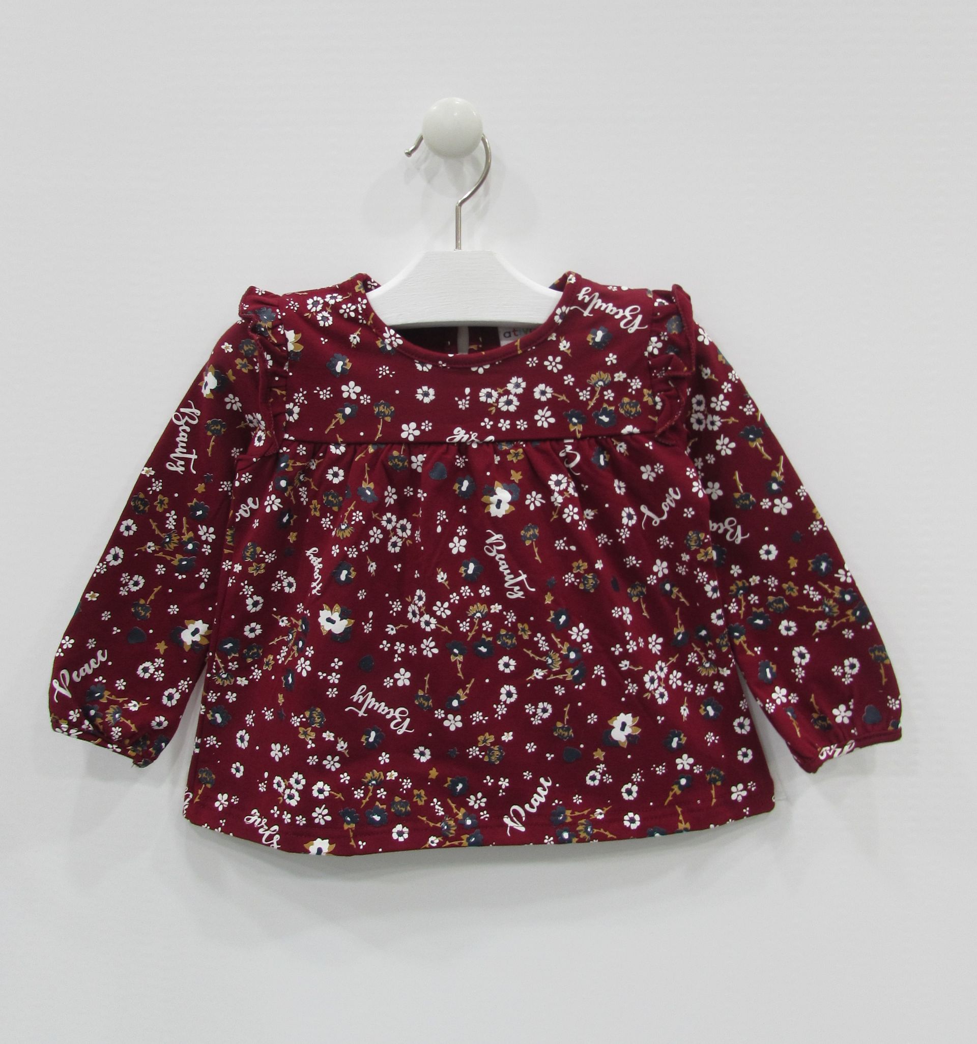 Camiseta estampada para bebé niña. Camiseta ancha y con apertura en la parte trasera con botón. Disponible en azul y granate.