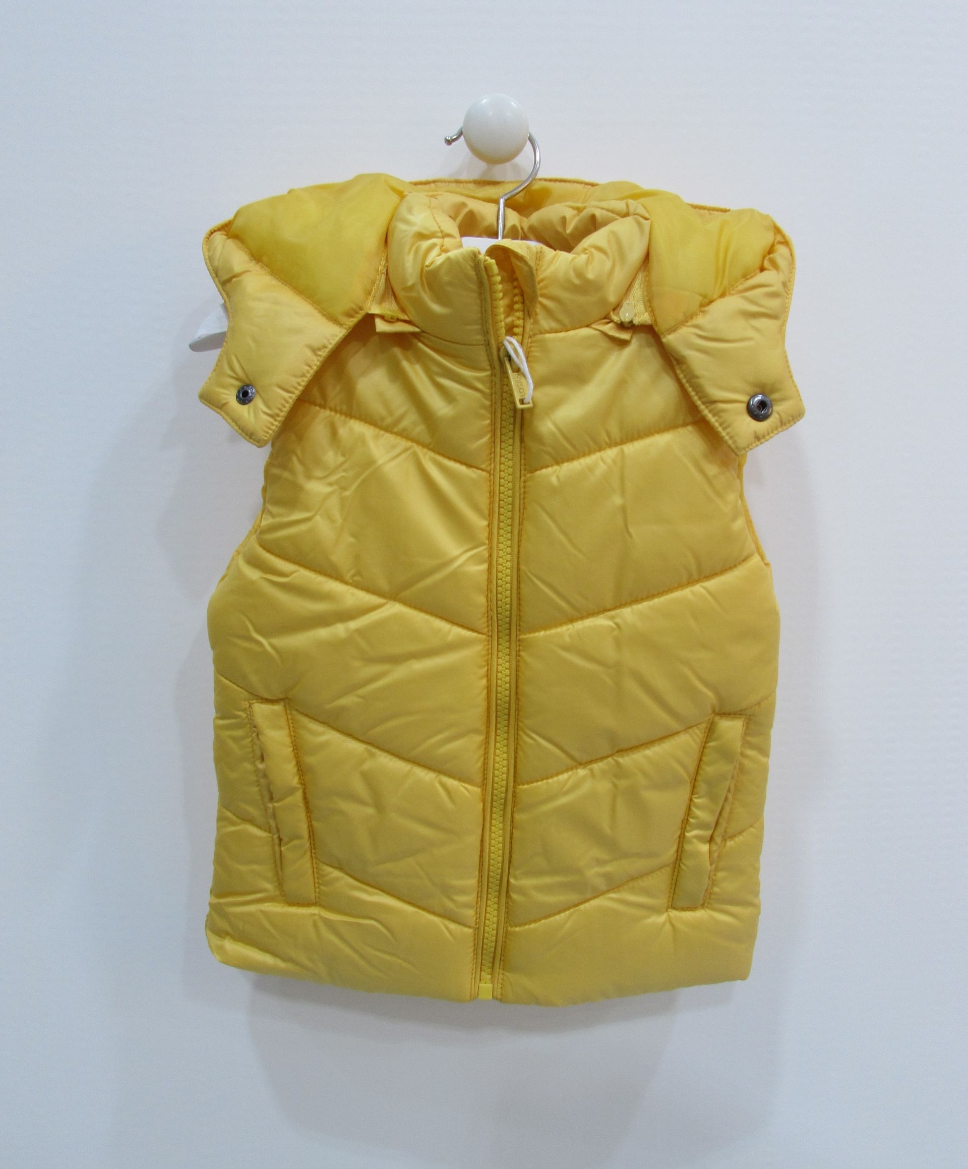 Chaleco acolchado con bolsillos delanteros con tapeta para niño. Chaleco con capucha desmontable con cremallera y cierre en cuello con automático. Abertura delantera con cremallera y tirador metálico personalizado de la marca Losan.