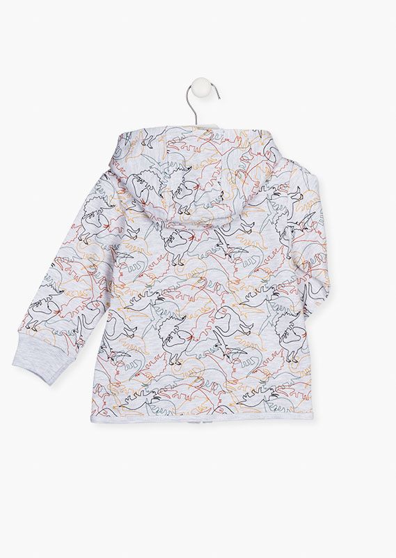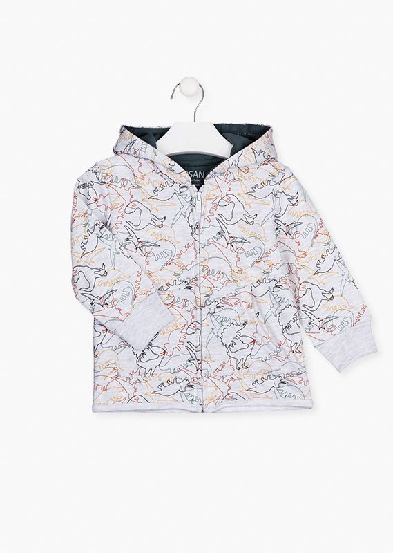 Chaqueta de algodón orgánico con dinosaurios para niño. Chaqueta de felpa perchada con capucha. Toda estampada, con forro en capucha y media luna en el interior del cuello en tejido de punto. Con bolsillo canguro. Con abertura delantera con cremallera personalizada con la marca Losan. Con tejido de canalé en puños y bajos. Disponible en marino y gris.