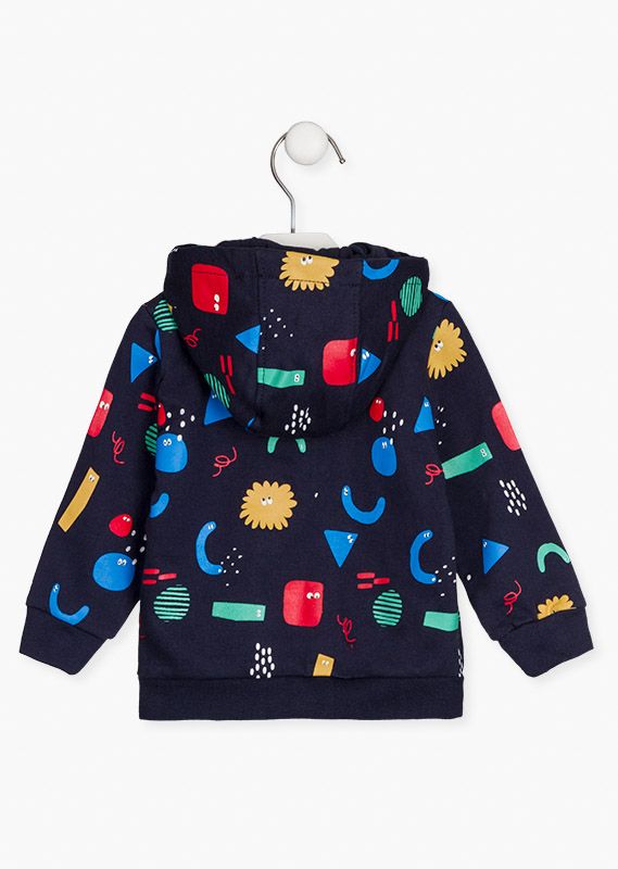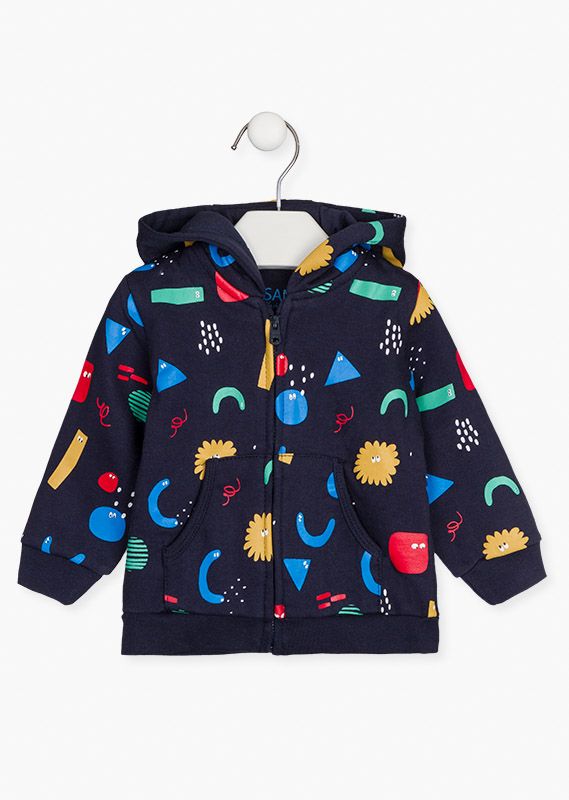 Chaqueta de felpa con figuras geométricas para bebé niño. Chaqueta de color azul marino con cierre delantero con cremallera. Bolsillo canguro. Con capucha con forro en tejido de punto. Con tejido de canalé en puños y bajos.