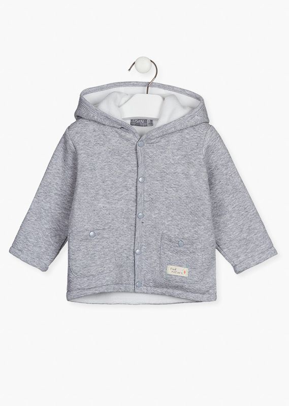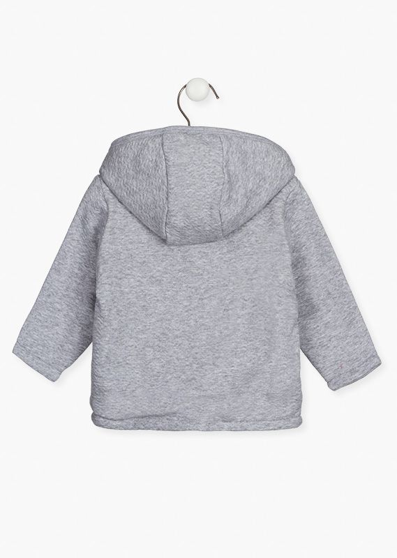 Chaqueta en color gris con interior en color gris para bebe niño. Chaqueta de felpa acolchada e interior de polar. Con abertura en delantero con automáticos. Con bolsillos en el delantero. Con etiqueta decorativa en bolsillo. Con capucha.