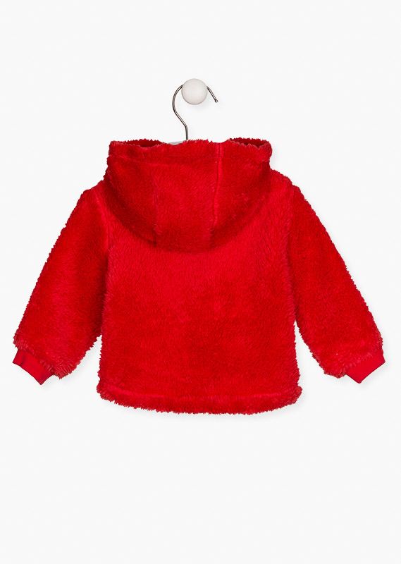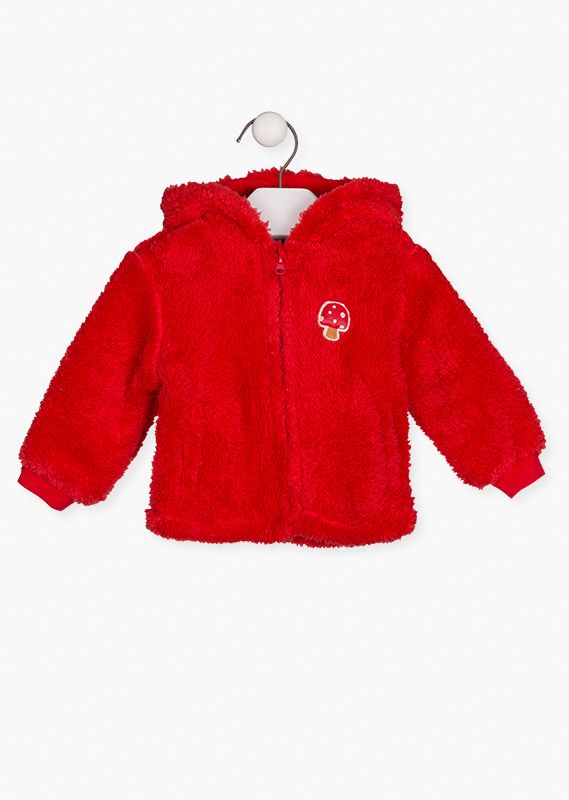 Chaqueta polar con capucha en rojo para bebé niña. Chaqueta de pelo sintético. Con abertura en delantero con cremallera. Con parche en el pecho. Con puños en mangas. Capucha forrada de punto liso.
