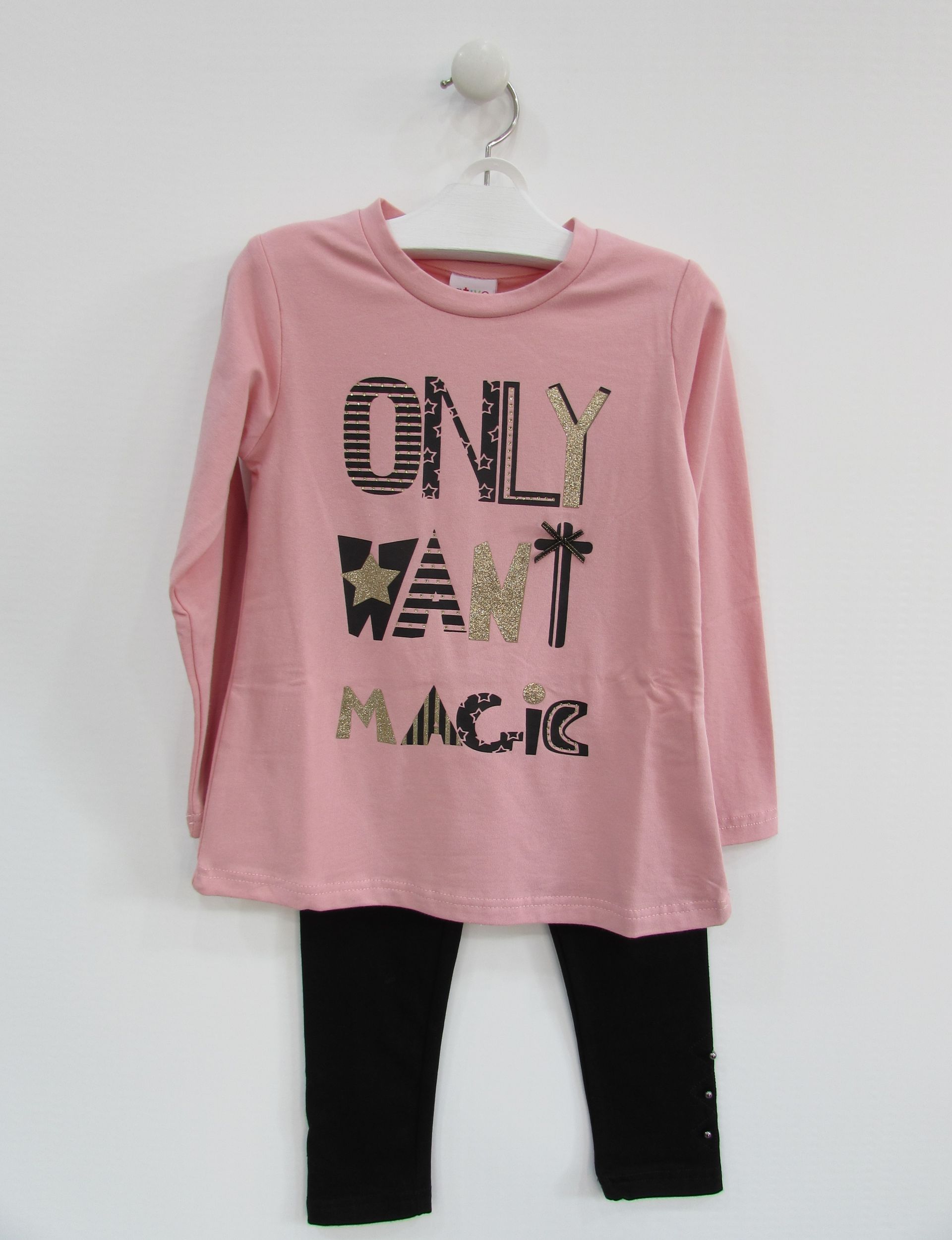 Conjunto camiseta manga larga con texto y leggin largo para chica. Disponible en rosa combinado con negro y crudo combinado con fucsia.