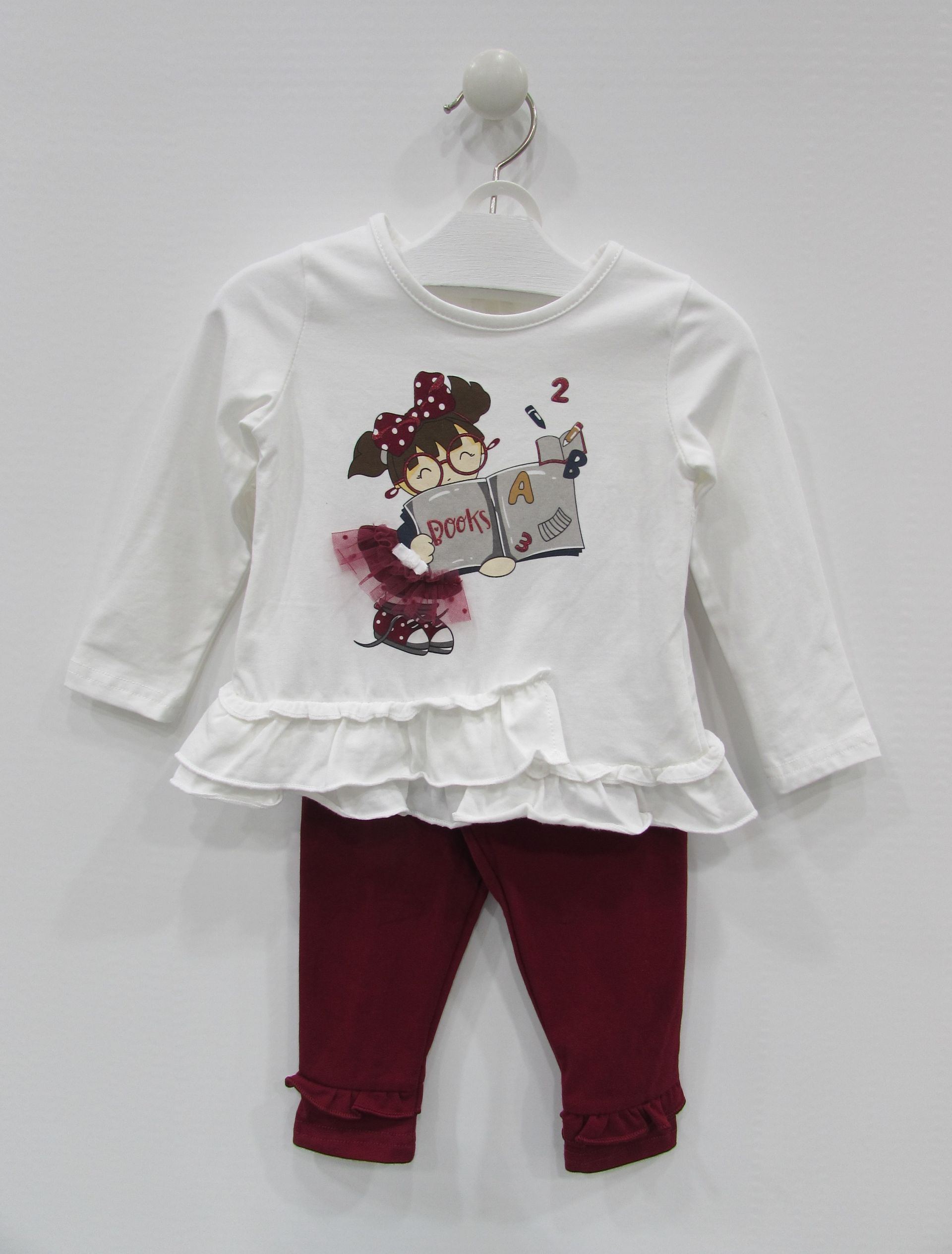Conjunto camiseta y leggin para bebé niña. Camiseta en color crudo estampada y volantes. Leggins en color azul marino y granate.