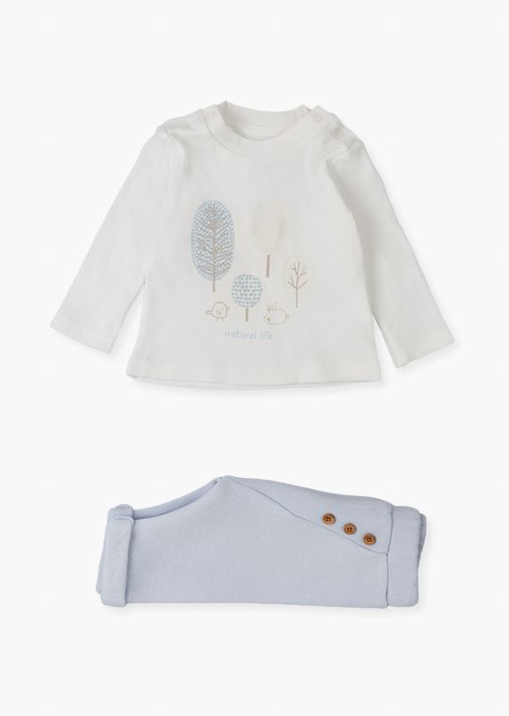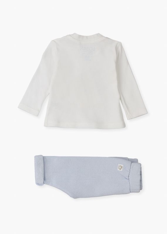 Conjunto de algodón orgánico camiseta y pantalón para recién nacido. Conjunto de camiseta de interlock en color crudo con estampados en el delantero. Con abertura en hombros con automáticos. Con cuello de canalé. Y pantalón de felpa perchada en color azul celeste. Con vuelta en bajos. Con corte en el delantero adornado con tres botones. Cinturilla todo gomas.