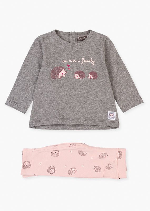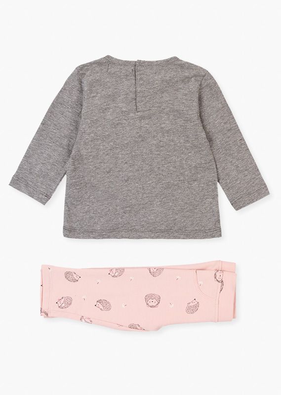 Conjunto de camiseta con estampado engomado y leggins para bebé niña. Conjunto de camiseta de punto de algodón orgánico de manga larga y cuello caja de color gris. Con etiqueta tejida decorativa en el bajo. Con abertura en parte superior de espalda con automáticos. Y leggins en felpa perchada de algodón orgánico de color rosa con estampado de erizos. Cintura en tejido de canalé. Con bolsillos simulados.