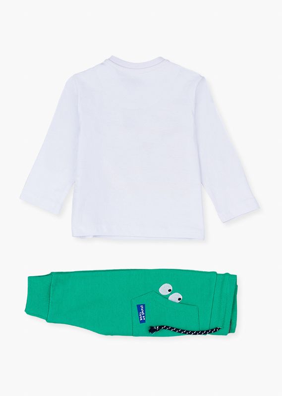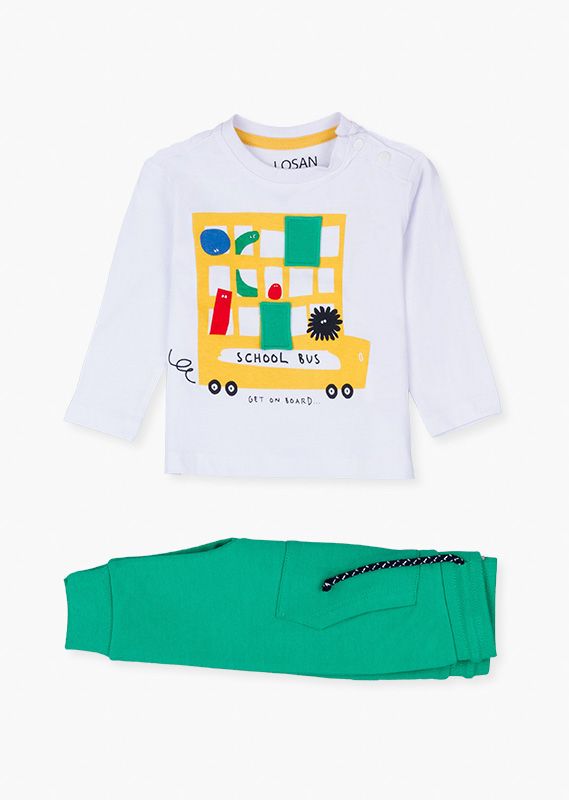 Conjunto de camiseta de color blanco y pantalón para bebé niño. Conjunto de camiseta de punto de manga larga y cuello caja. Con estampado de autobús y parches en el delantero. Con abertura en el hombro con automáticos. Con cubrecosturas y media luna en el interior del cuello. Y pantalón de felpa perchada en color verde con bolsillo canguro. Con estampado en el bolsillo y parches de ojos. Con cintura elástica en tejido de canalé con cordón ajustador. Con puños en bajos en tejido de canalé.