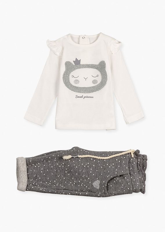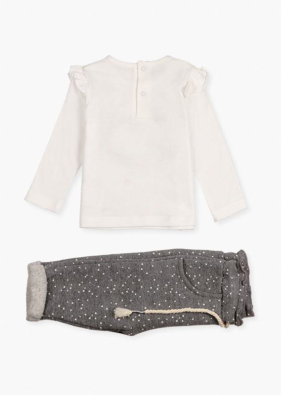Conjunto de camiseta de manga larga y pantalón para bebé niña. Conjunto de camiseta de punto en color crudo. Cuello caja con volantes en los hombros. Con estampado y bordado en el delantero con purpurina. Con abertura en la parte superior de la espalda con automáticos. Y pantalón de felpa perchada con estampados de corazones. Con vuelta en bajos. Cinturilla elástica con volante y cuerda ajustadora. Con bolsillos delanteros. Con bordado de corazón en la pernera.