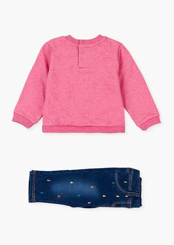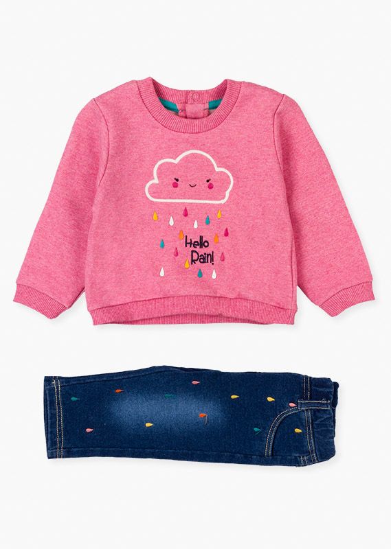 Conjunto de sudadera en color rosa y pantalón para bebé niña. Conjunto de sudadera cuello caja de felpa perchada. Con bordado y estampado engomado en el delantero de nube y lluvia. Con tejido de canalé en cuello, puños y bajos. Con cubrecosturas en el interior del cuello. Con abertura en la parte superior de la espalda con automáticos. Y pantalón de felpa no perchada con efecto denim. Con bordados en la parte delantera. Con cintura elástica con trabillas. Con bolsillos delanteros y bragueta simulados.