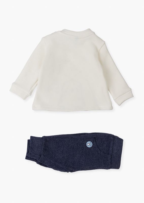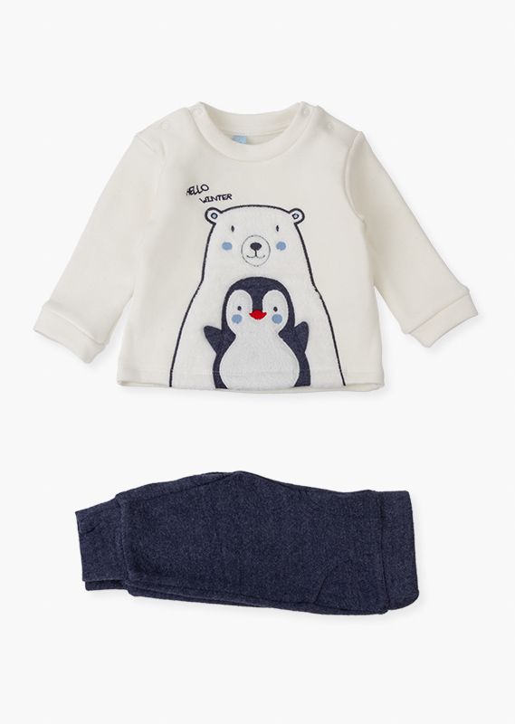 Conjunto de sudadera y pantalón con puños para recién nacido. Conjunto de sudadera en felpa perchada suave de manga larga con abertura en hombros con automáticos. Con parches de pelo y bordado en el delantero haciendo animales polares. Y pantalón de interlock perchado en color azul oscuro con etiqueta decorativa en pernera. Cinturilla elástica con bragueta y bolsillos simulada.