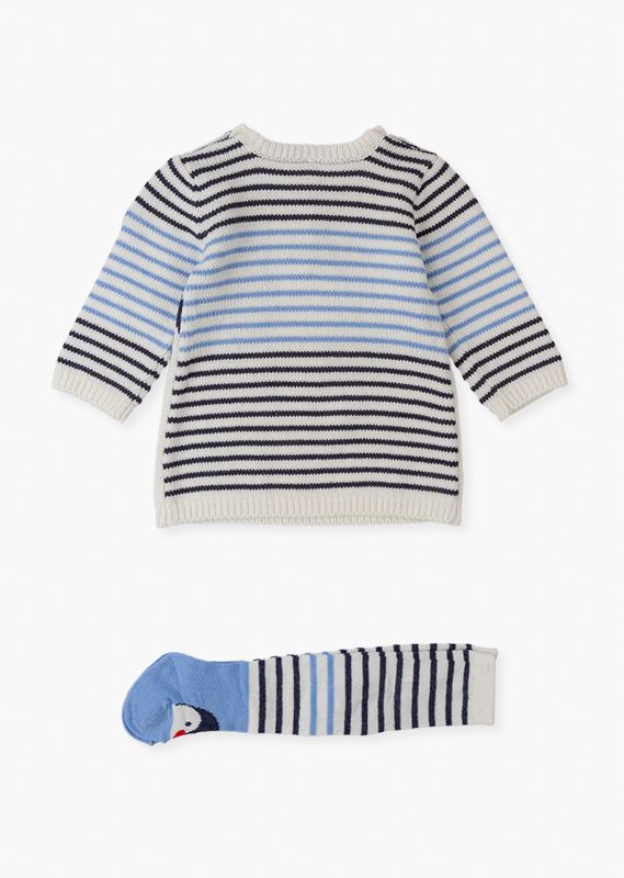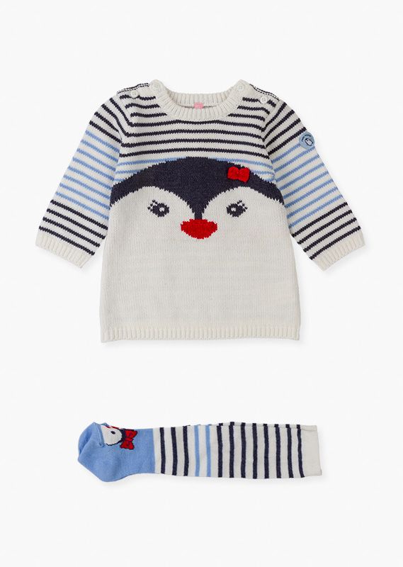 Conjunto de vestido con pingüino y leotardos de rayas para recién nacida. Conjunto de vestido de tricotosa de manga larga con abertura en hombros con botones. Con mangas, pecho y espalda de rayas y bajo delantero liso. Con parche de lazo. Y leotardos de tricotosa de rayas con pingüinos en los pies.