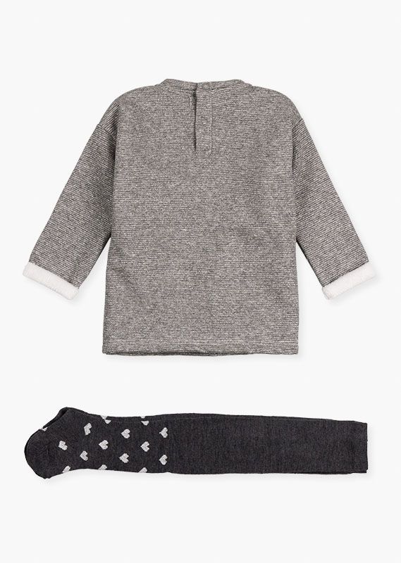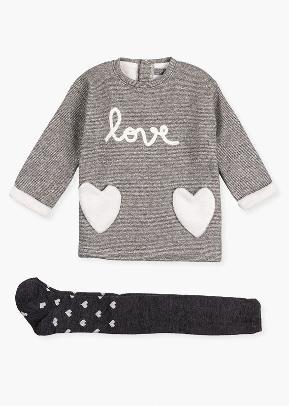 Conjunto de vestido de doble cara y leotardo para bebé niña. Conjunto de vestido de felpa manga larga con cuello caja. En color gris con interior de pelo en color crudo. Con vuelta en mangas. Con bolsillos de corazón de pelo en los bajos del delantero. Con bordado de amor en el pecho. Con abertura en la parte superior de la espalda con automáticos. Y leotardo de tricotosa con Jacquard de corazones y detalles de hilo de lurex. Cinturilla elástica.