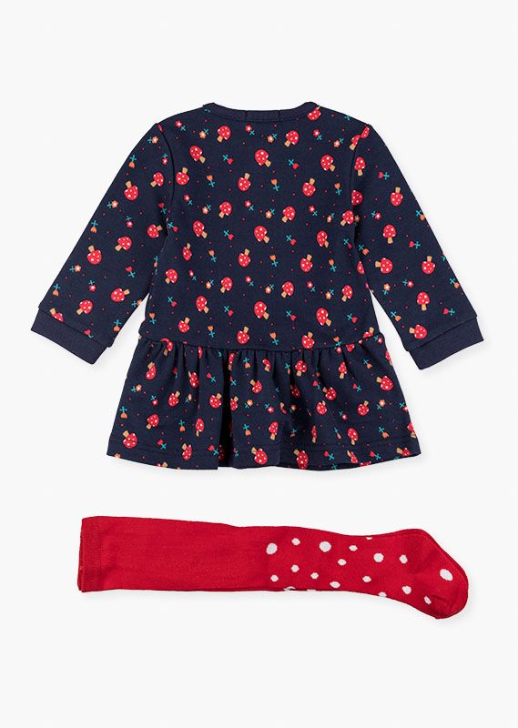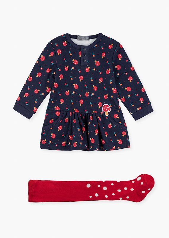 Conjunto de vestido de manga larga cuello caja y leotardo para bebé niña. Conjunto de vestido de felpa no perchada en color azul estampado de setas y flores. Con abertura en cuello con automáticos. Con puños y cuello en tejido de canalé. Con bolsillos en la parte de la falda. Con parche cosido en falda. Y leotardo de tricotosa en color rojo con Jacquard haciendo bolitos en color blanco y una seta en el trasero.