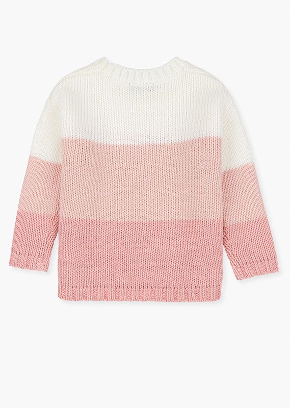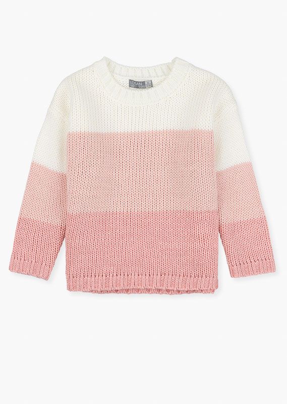 Jersey de cuello caja en colores rosas y natural para niña. Jersey de tricotosa de manga larga.