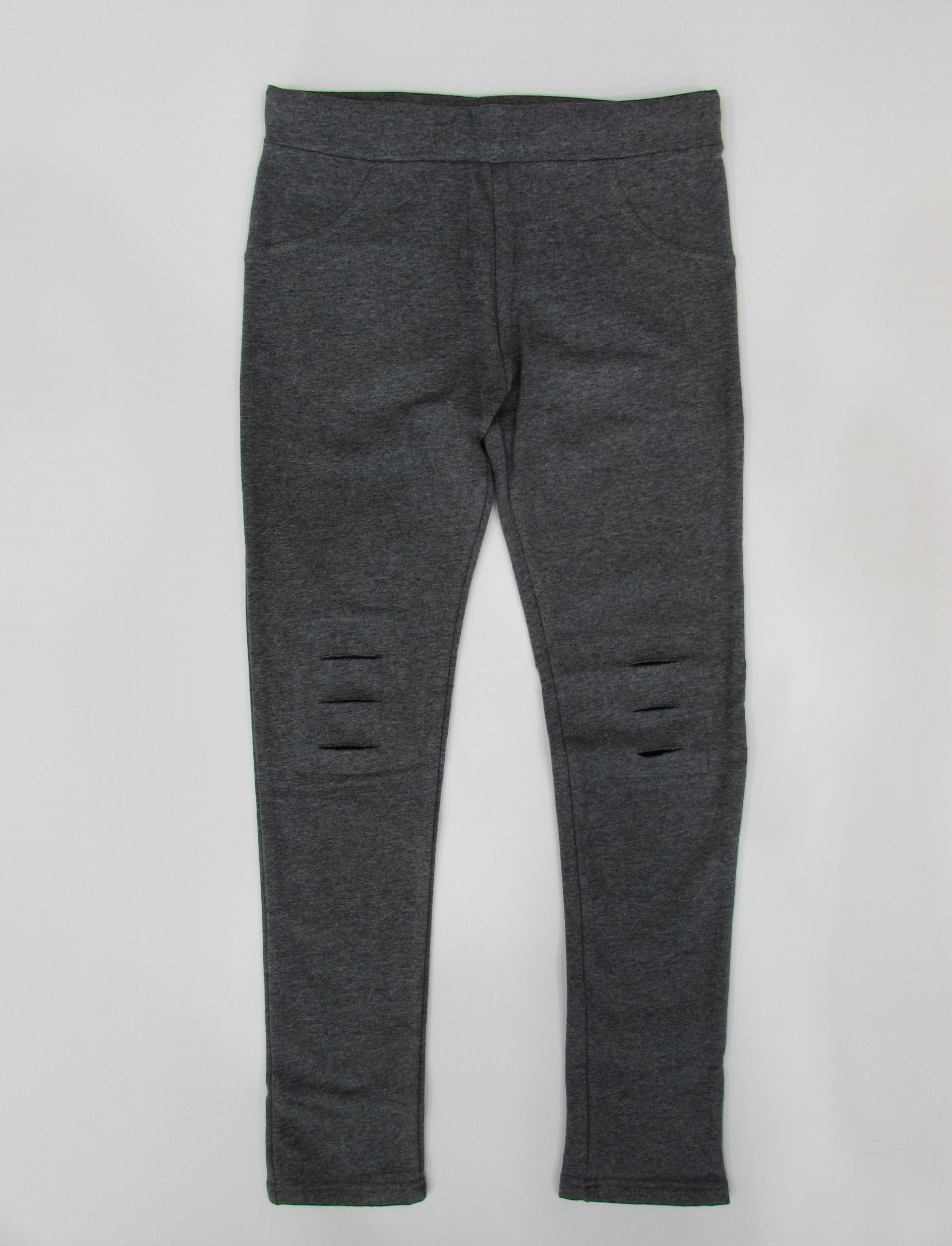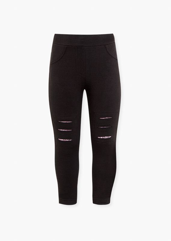 Leggins con cortes y parche interior de lentejuelas para niña. Leggins en tejido de felpa perchada con bolsillos delanteros y bragueta simulada. Bolsillos traseros de plastón. Ajustador interior de cintura con botón. Disponible en gris oscuro y gris claro.
