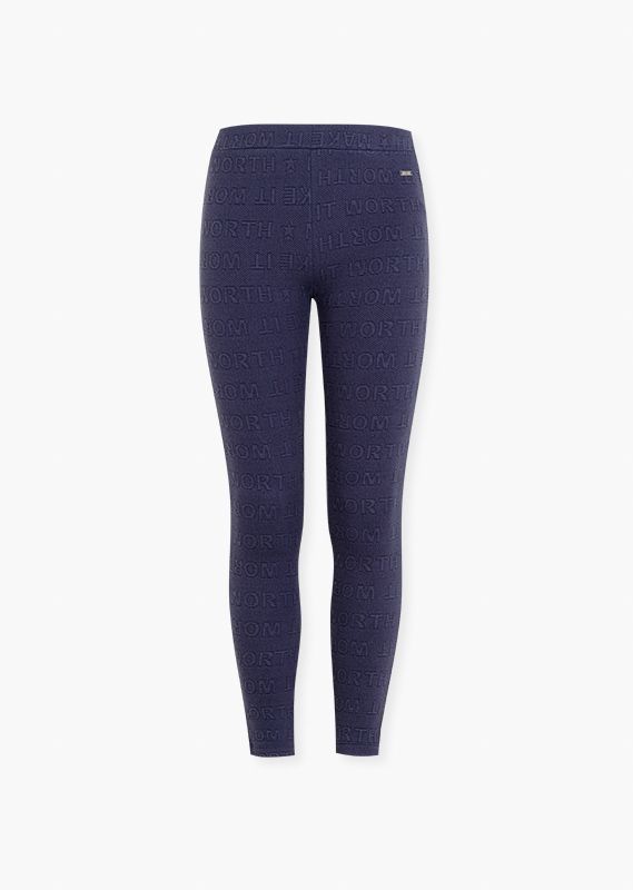 Leggins con grabado de letras para chica. Leggins en interlock en color azul marino con cintura elástica. Con etiqueta metálica en el delantero.