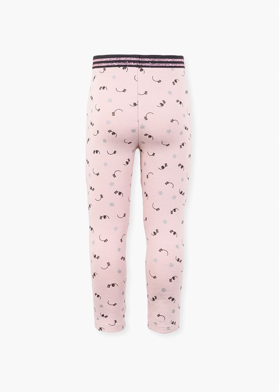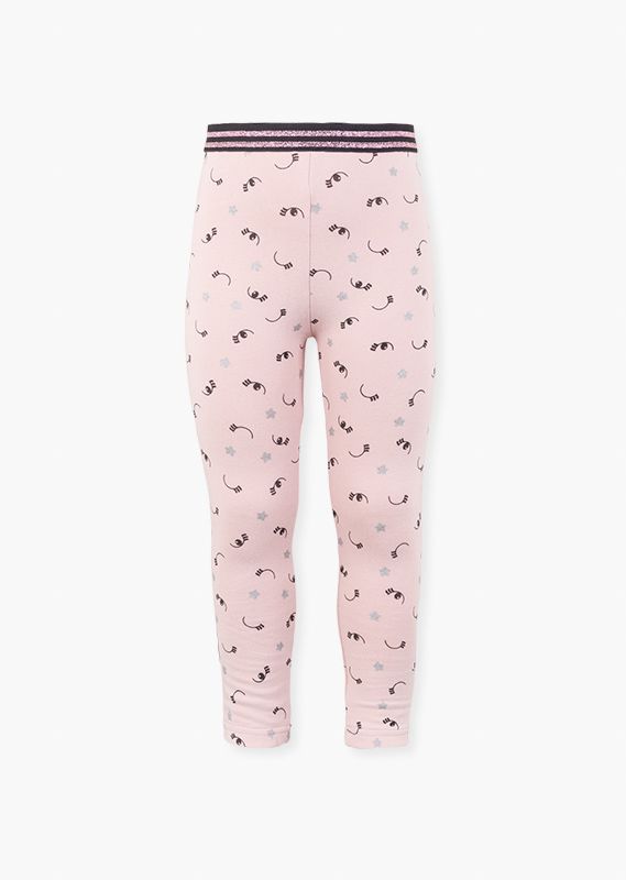 Leggins todo estampado con ojos y estrellas para niña. Leggins en tejido de punto de color rosa con goma de rayas de purpurina en cintura. Con detalles de purpurina en el estampado.