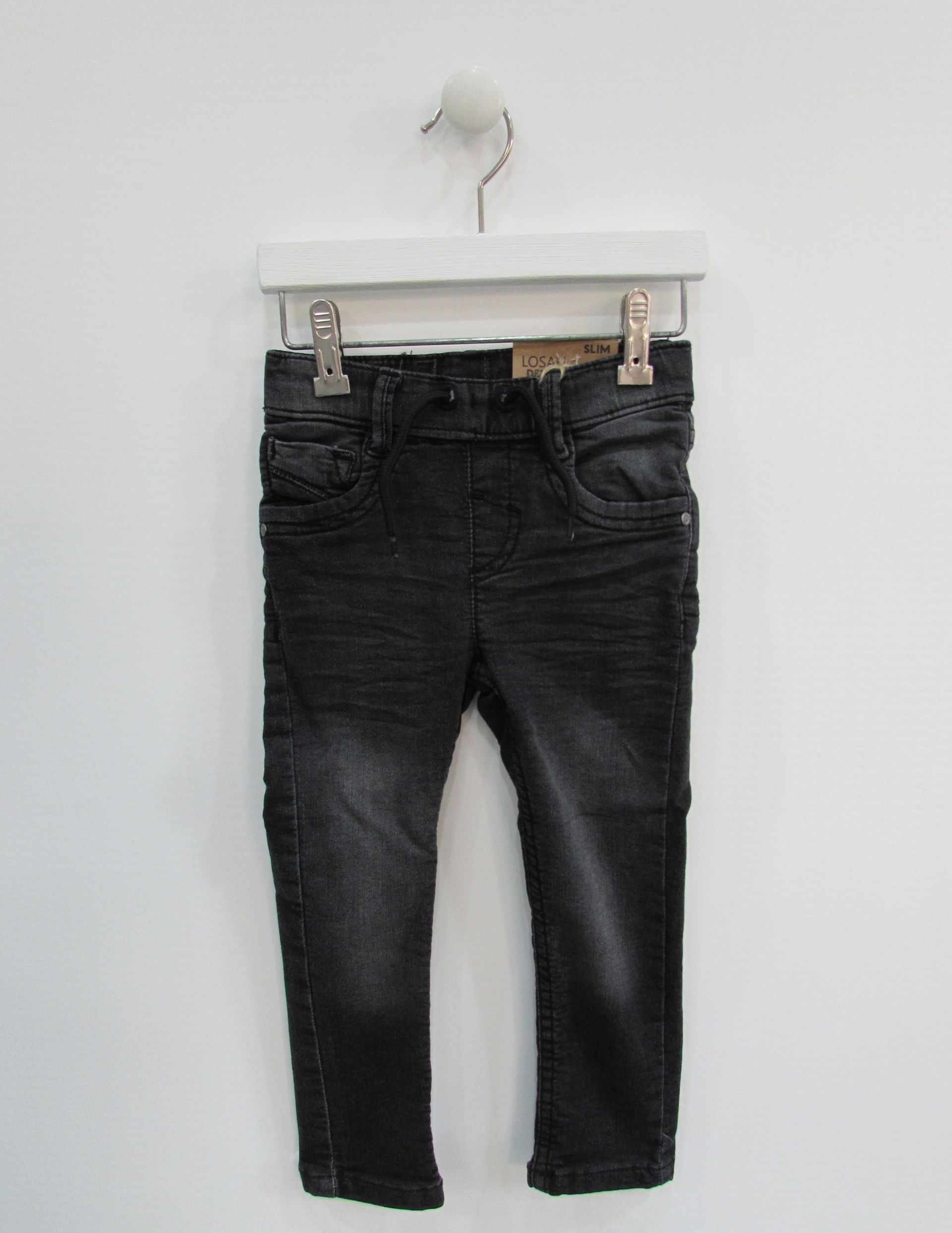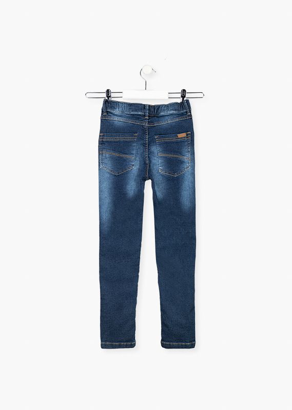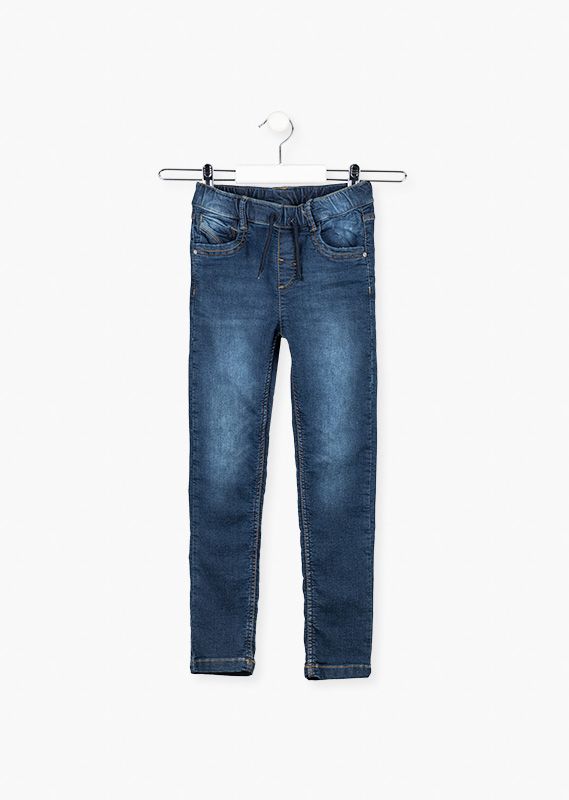 Pantalón con cordón en cintura y corte pitillo para niño. Pantalón efecto vaquero con trabillas en la cintura. Remaches en los bolsillos delanteros. Ajustador interior en la cintura. Etiqueta en el bolsillo posterior. Disponible en azul denim y gris.