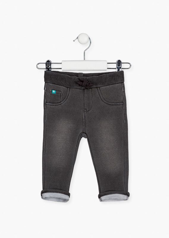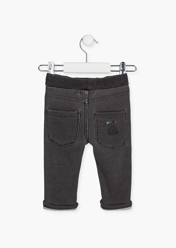 Pantalón con iglú estampado en el bolsillo para bebé niño. Pantalón vaquero de felpa de color gris. Con cintura elástica en tejido de canalé con cordón. Vuelta en el bajo. Corte pitillo. Ajustador interior en la cintura. Interior de pelo.