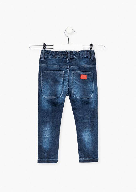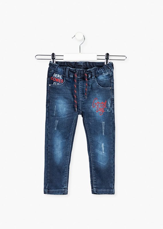 Pantalón de efecto vaquero de corte pitillo con bordados para niño. Pantalón con detalle de rotos y desgastados. Etiqueta de cuero en la parte posterior. Trabillas en la cintura. Ajustador interior y cordón decorativo.