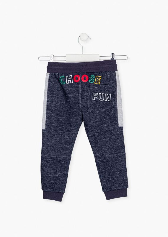 Pantalón de punto con cintura elástica con cordón para niño. Pantalón en color azul marino vigoré con cortes en rodillas y piezas a contraste en color gris en los laterales. Con estampado en el trasero y bolsillo con estampado.