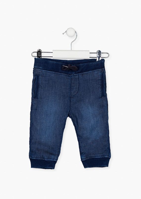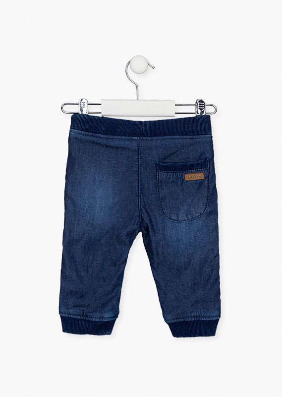 Pantalón vaquero con bolsillos en tejido de canalé para bebé niño. Pantalón con puños y cintura en tejido de canalé. Cordón decorativo y ajustador interior en la cintura. Bragueta simulada. Con forro de punto. Con un bolsillo trasero con etiqueta de marca.