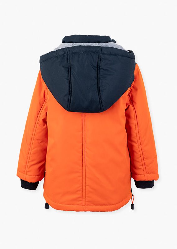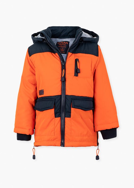 Parka con bolsillos en color naranja para niño. Parka acolchada con capucha. Abertura delantera y bolsillos delanteros con velcro. Tiradores metálicos personalizados de la marca Losan con detalle de cordón. Terminación de puños en tejido de canalé. Interior forrado en tejido polar.