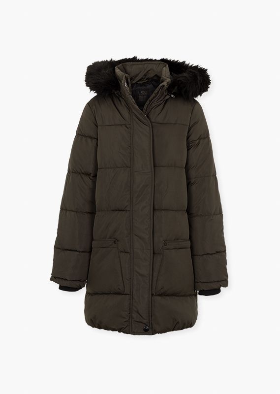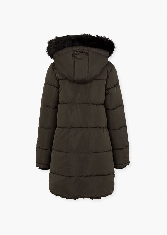 Parka con capucha desmontable con pieza de pelo para chica. Parka acolchada. Cierre delantero con cremallera y automáticos. Bolsillos de parche en el delantero. Puños ocultos de canalé.