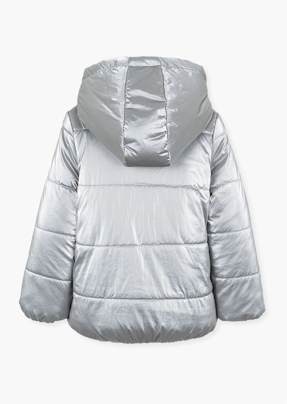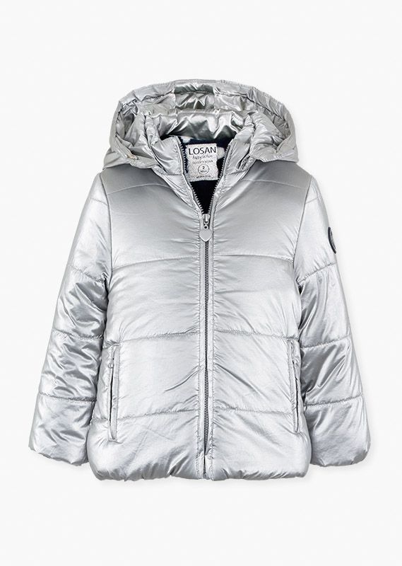 Parka con interior de pelo con bolos para niña. Parka acolchada con capucha desmontable. En color plata brillante. Con bolsillos en el delantero con cremallera. Con cierre delantero con cremallera con tirador de corazón. Con etiqueta de goma en la manga. Con etiqueta identificativa en el interior.