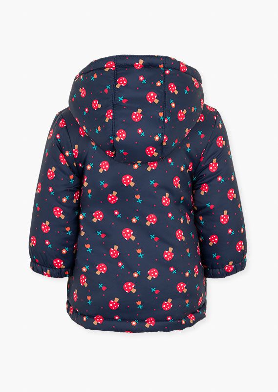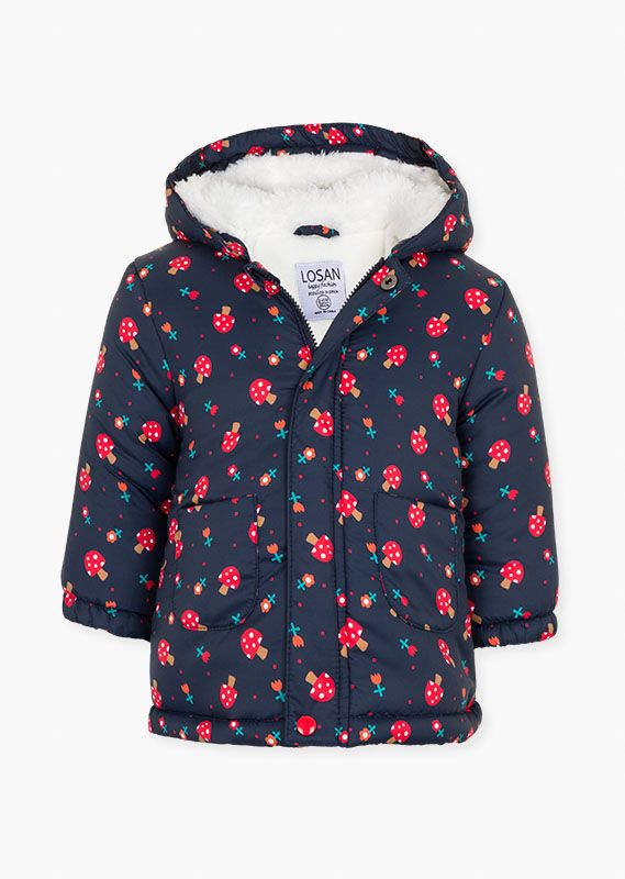 Parka estampada de setas y flores para bebé niña. Parka con capucha en color azul marino . Con forro interior de pelo. Con abertura delantera con cremallera y tapeta con automáticos. Con bolsillos en el bajo. Con puños elásticos.