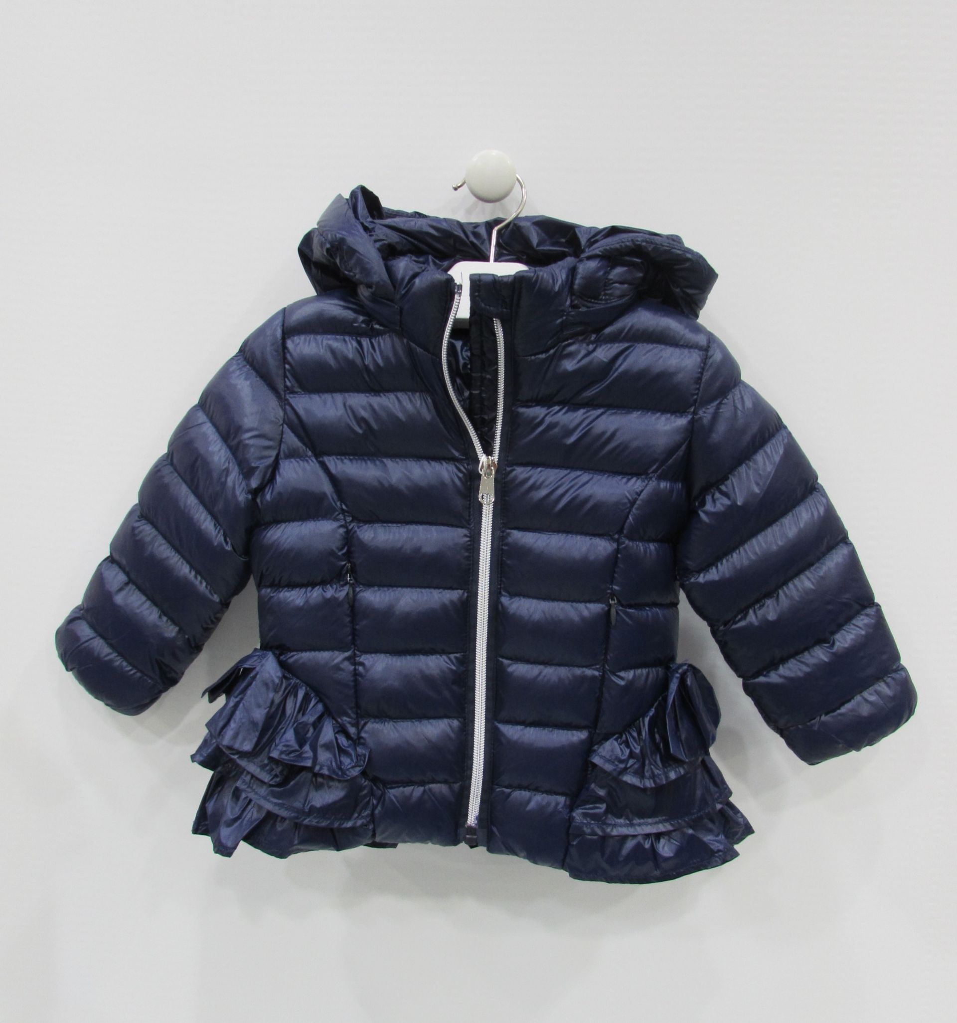 Parka ligera con capucha para niña. Parka con capucha desmontable y cremallera. Cremallera en los bolsillos y un pequeño volante en la parte trasera y lateral. Disponible en color azul y rosa.