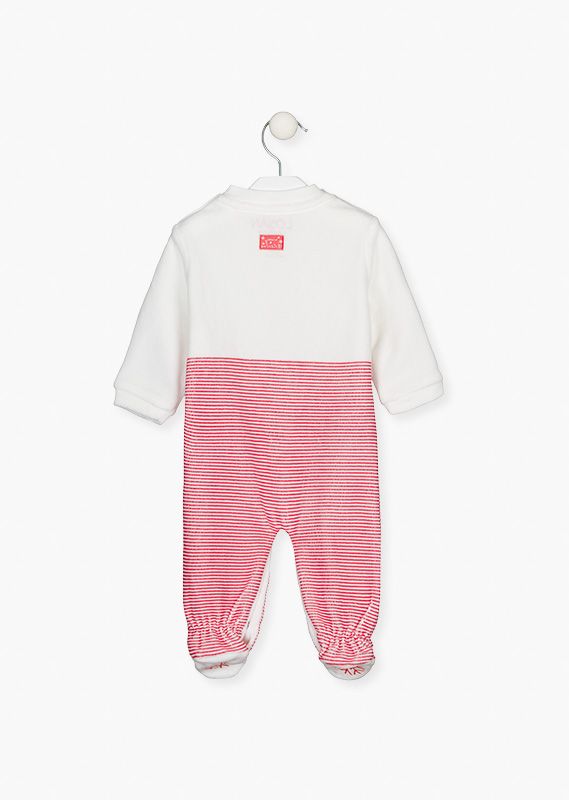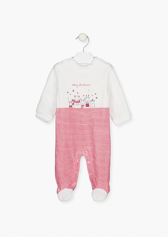 Pijama con bordado invernal y navideño para bebé. Pijama de terciopelo con pantalón de rayas. Cuello caja con abertura en hombros con automáticos. Y abertura en entrepiernas con automáticos. Con copo de nieve estampado antideslizante en la suela.