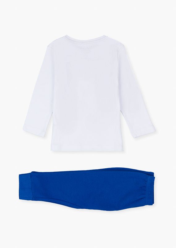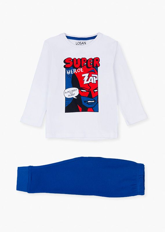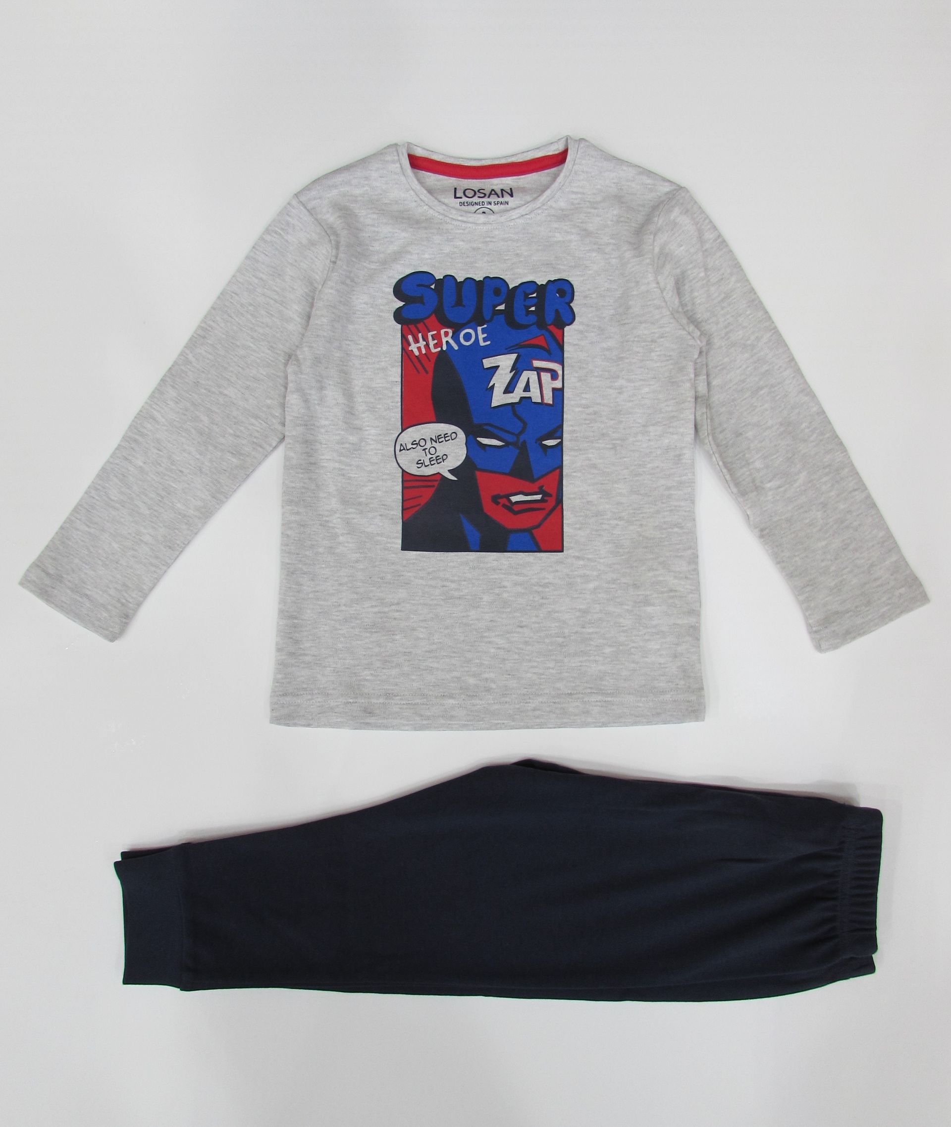 Pijama de algodón de manga larga para niño. Pijama de camiseta con cuello redondo con super héroe estampado en el delantero. Pantalón de color liso con cintura elástica y puño en el bajo. Disponible en blanco y gris. Presentado en bolsa de tela.