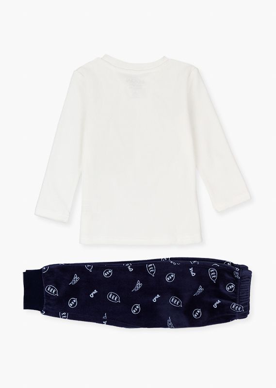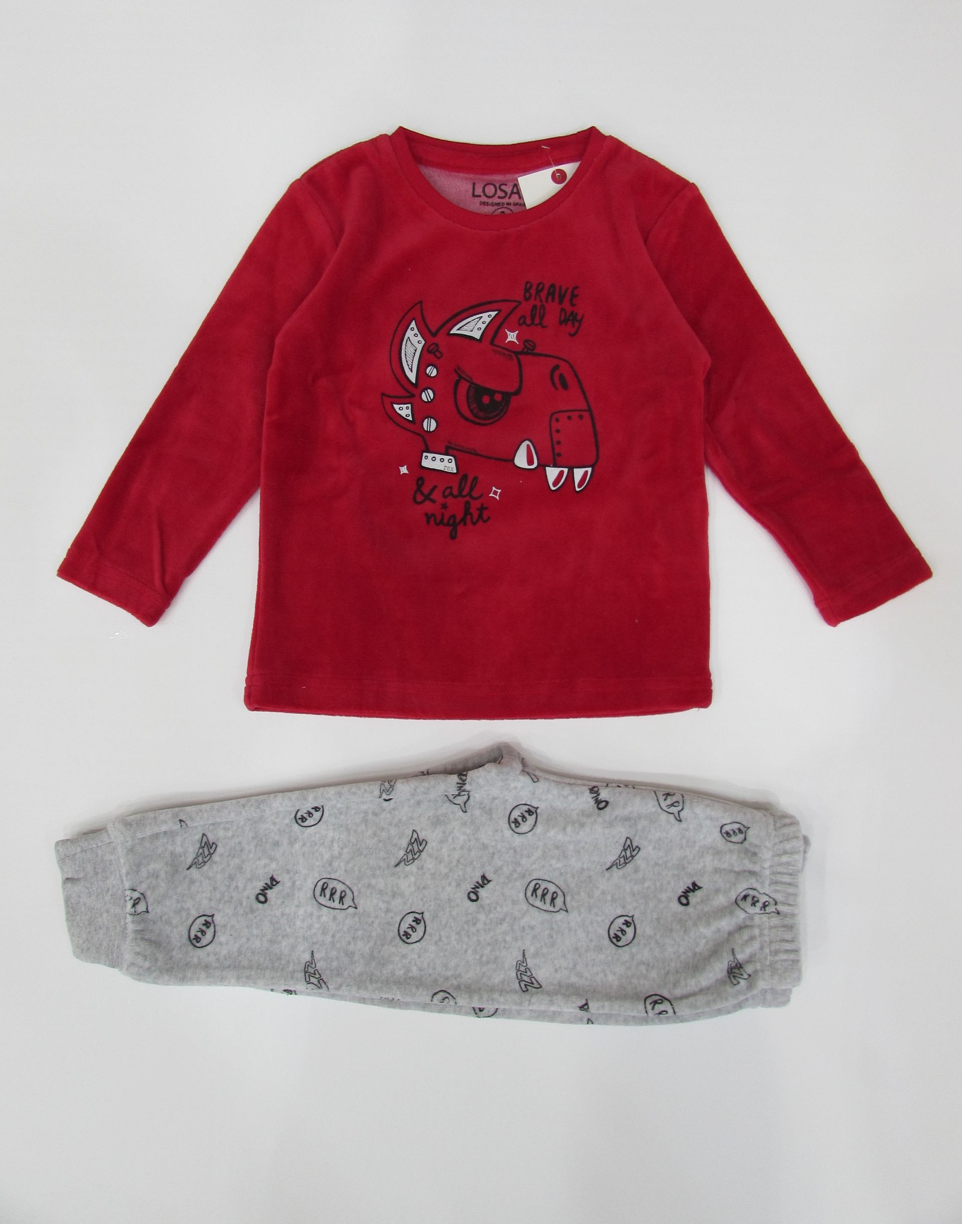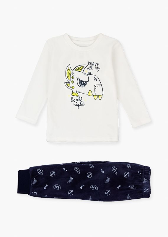 Pijama de dinosaurios para niño. Pijama en tejido de terciopelo con camiseta de manga larga y cuello redondo. Con estampado en el delantero. Y pantalón todo estampado con puño en el bajo. Disponible en crudo y rojo. Presentado en bolsa de tela.